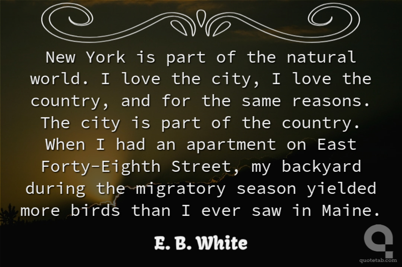 New York is part of the natural world. I love the city, I love the country, and for the same reasons. The city is part of the country. When I had an apartment on East Forty-Eighth Street, my backyard during the migratory season yielded more birds than I ever saw in Maine.