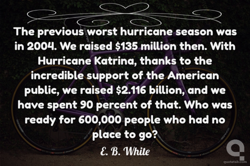 The previous worst hurricane season was in 2004. We raised $135 million then. With Hurricane Katrina, thanks to the incredible support of the American public, we raised $2.116 billion, and we have spent 90 percent of that. Who was ready for 600,000 people who had no place to go?