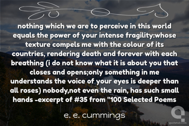 nothing which we are to perceive in this world equals the power of your intense fragility:whose texture compels me with the colour of its countries, rendering death and forever with each breathing (i do not know what it is about you that closes and opens;only something in me understands the voice of your eyes is deeper than all roses) nobody,not even the rain, has such small hands -excerpt of #35 from "100 Selected Poems