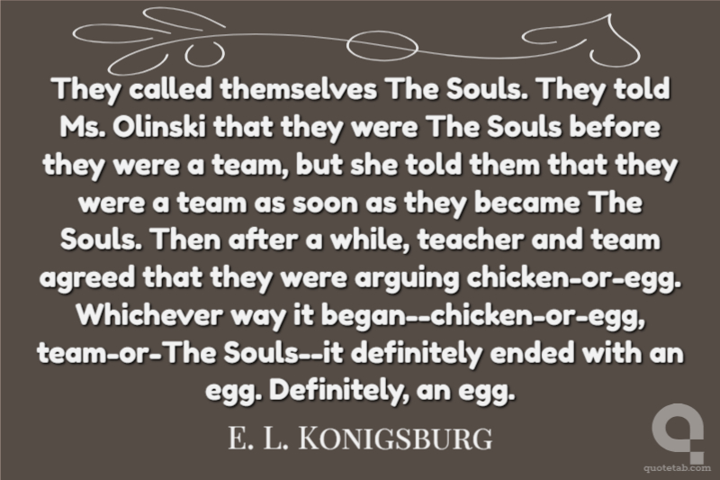They called themselves The Souls. They told Ms. Olinski that they were The Souls before they were a team, but she told them that they were a team as soon as they became The Souls. Then after a while, teacher and team agreed that they were arguing chicken-or-egg. Whichever way it began--chicken-or-egg, team-or-The Souls--it definitely ended with an egg. Definitely, an egg.