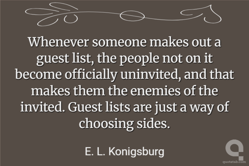 Whenever someone makes out a guest list, the people not on it become officially uninvited, and that makes them the enemies of the invited. Guest lists are just a way of choosing sides.