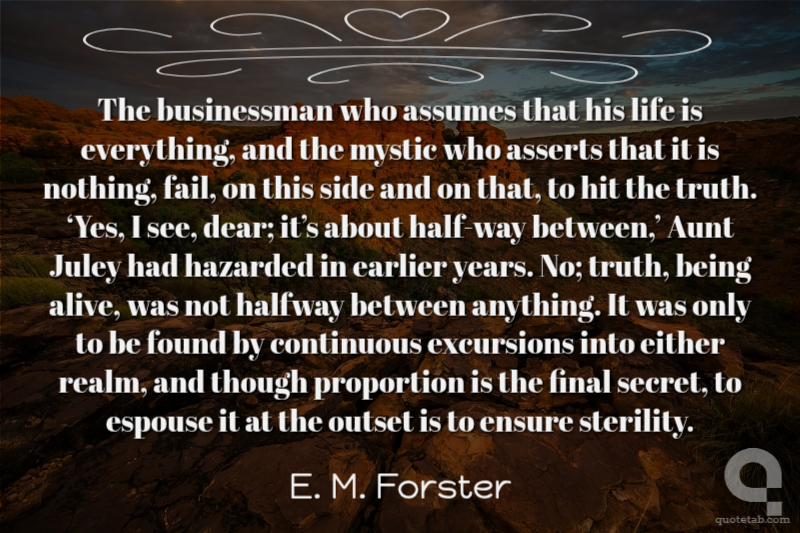 The businessman who assumes that his life is everything, and the mystic who asserts that it is nothing, fail, on this side and on that, to hit the truth. ‘Yes, I see, dear; it’s about half-way between,’ Aunt Juley had hazarded in earlier years. No; truth, being alive, was not halfway between anything. It was only to be found by continuous excursions into either realm, and though proportion is the final secret, to espouse it at the outset is to ensure sterility.