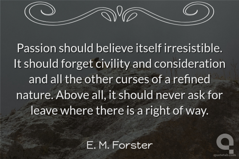 Passion should believe itself irresistible. It should forget civility and consideration and all the other curses of a refined nature. Above all, it should never ask for leave where there is a right of way.