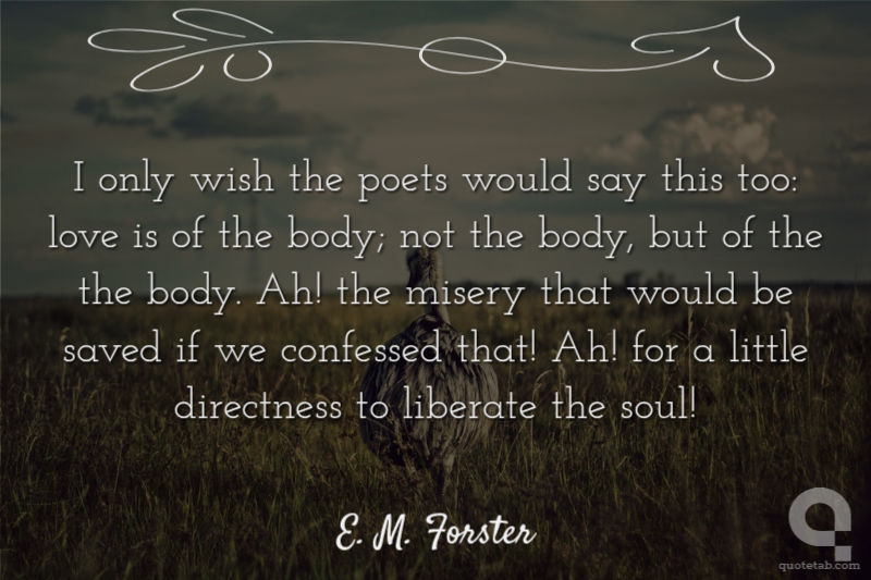 I only wish the poets would say this too: love is of the body; not the body, but of the the body. Ah! the misery that would be saved if we confessed that! Ah! for a little directness to liberate the soul!