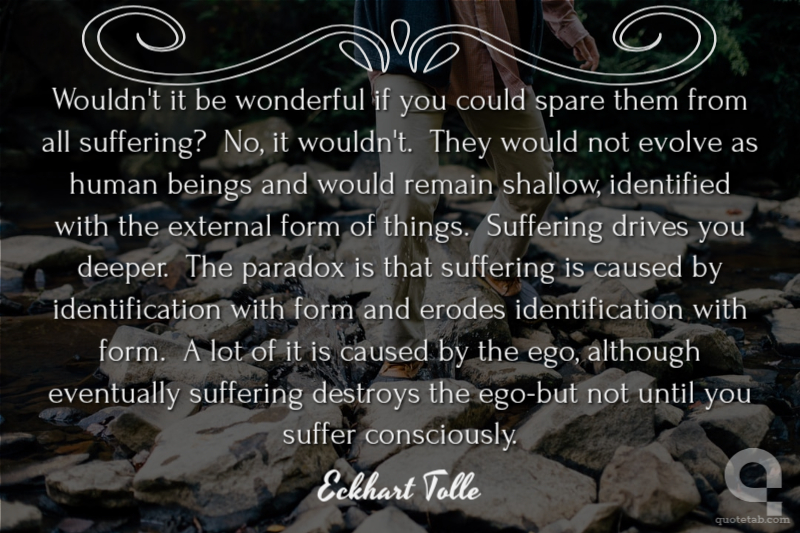 Wouldn't it be wonderful if you could spare them from all suffering? No, it wouldn't. They would not evolve as human beings and would remain shallow, identified with the external form of things. Suffering drives you deeper. The paradox is that suffering is caused by identification with form and erodes identification with form. A lot of it is caused by the ego, although eventually suffering destroys the ego-but not until you suffer consciously.