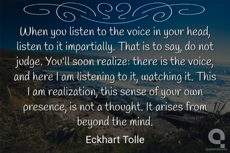 When you listen to the voice in your head, listen to it impartially. That is to say, do not judge. You'll soon realize: there is the voice, and here I am listening to it, watching it. This I am realization, this sense of your own presence, is not a thought. It arises from beyond the mind.