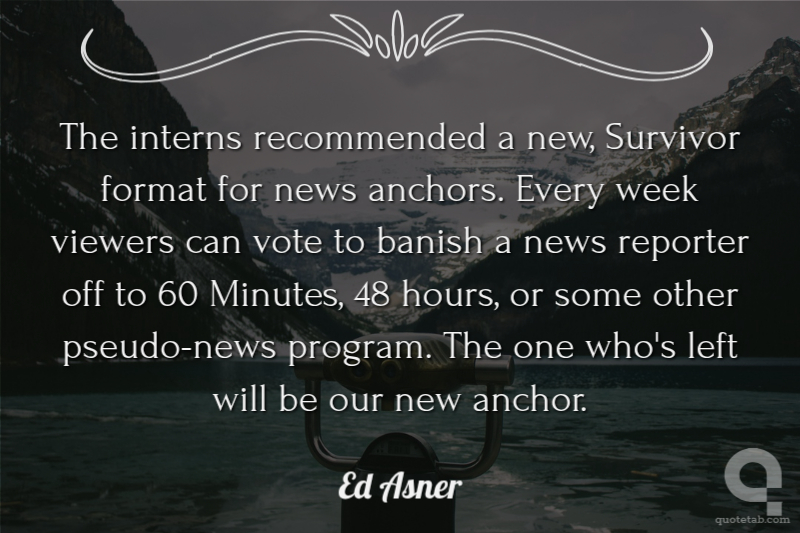 The interns recommended a new, Survivor format for news anchors. Every week viewers can vote to banish a news reporter off to 60 Minutes, 48 hours, or some other pseudo-news program. The one who's left will be our new anchor.