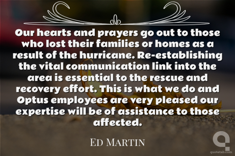 Our hearts and prayers go out to those who lost their families or homes as a result of the hurricane. Re-establishing the vital communication link into the area is essential to the rescue and recovery effort. This is what we do and Optus employees are very pleased our expertise will be of assistance to those affected.