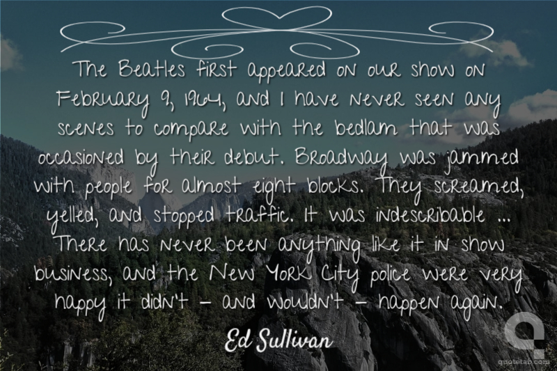 The Beatles first appeared on our show on February 9, 1964, and I have never seen any scenes to compare with the bedlam that was occasioned by their debut. Broadway was jammed with people for almost eight blocks. They screamed, yelled, and stopped traffic. It was indescribable ... There has never been anything like it in show business, and the New York City police were very happy it didn't - and wouldn't - happen again.