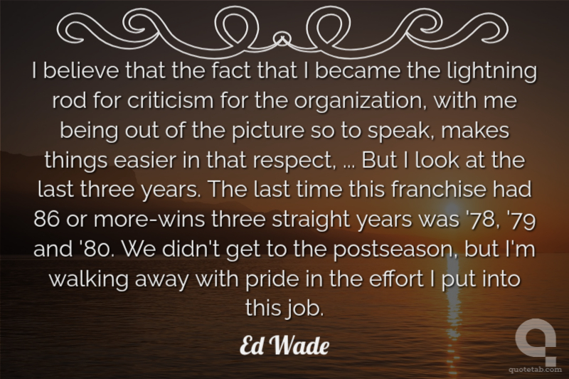 I believe that the fact that I became the lightning rod for criticism for the organization, with me being out of the picture so to speak, makes things easier in that respect, ... But I look at the last three years. The last time this franchise had 86 or more-wins three straight years was '78, '79 and '80. We didn't get to the postseason, but I'm walking away with pride in the effort I put into this job.