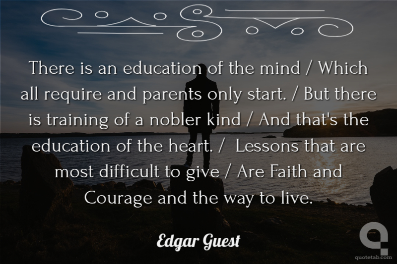 There is an education of the mind / Which all require and parents only start. / But there is training of a nobler kind / And that's the education of the heart. / Lessons that are most difficult to give / Are Faith and Courage and the way to live.