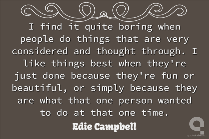 I find it quite boring when people do things that are very considered and thought through. I like things best when they're just done because they're fun or beautiful, or simply because they are what that one person wanted to do at that one time.