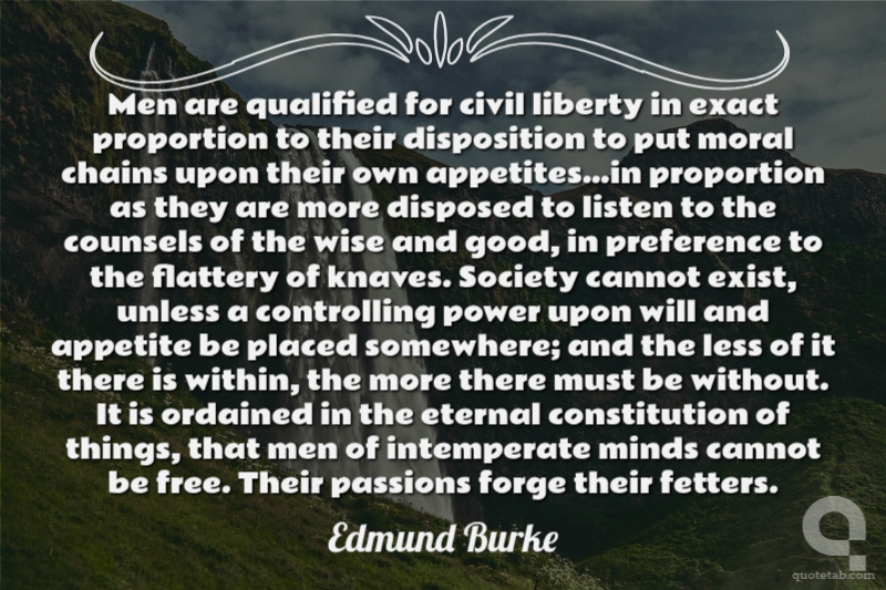 Men are qualified for civil liberty in exact proportion to their disposition to put moral chains upon their own appetites…in proportion as they are more disposed to listen to the counsels of the wise and good, in preference to the flattery of knaves. Society cannot exist, unless a controlling power upon will and appetite be placed somewhere; and the less of it there is within, the more there must be without. It is ordained in the eternal constitution of things, that men of intemperate minds cannot be free. Their passions forge their fetters.