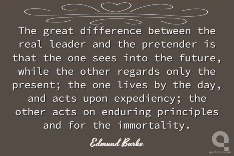 The great difference between the real leader and the pretender is that the one sees into the future, while the other regards only the present; the one lives by the day, and acts upon expediency; the other acts on enduring principles and for the immortality.