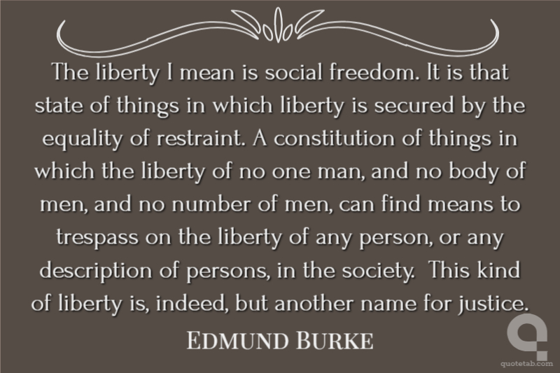 The liberty I mean is social freedom. It is that state of things in which liberty is secured by the equality of restraint. A constitution of things in which the liberty of no one man, and no body of men, and no number of men, can find means to trespass on the liberty of any person, or any description of persons, in the society. This kind of liberty is, indeed, but another name for justice.