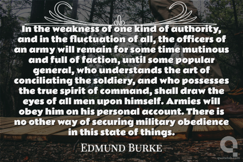 In the weakness of one kind of authority, and in the fluctuation of all, the officers of an army will remain for some time mutinous and full of faction, until some popular general, who understands the art of conciliating the soldiery, and who possesses the true spirit of command, shall draw the eyes of all men upon himself. Armies will obey him on his personal account. There is no other way of securing military obedience in this state of things.