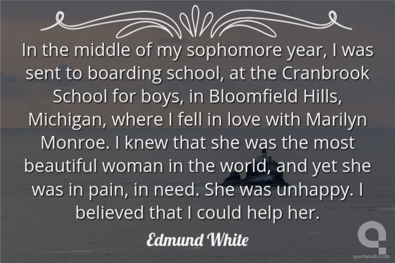 In the middle of my sophomore year, I was sent to boarding school, at the Cranbrook School for boys, in Bloomfield Hills, Michigan, where I fell in love with Marilyn Monroe. I knew that she was the most beautiful woman in the world, and yet she was in pain, in need. She was unhappy. I believed that I could help her.