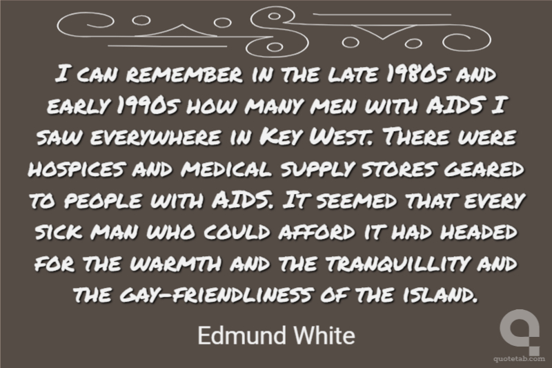 I can remember in the late 1980s and early 1990s how many men with AIDS I saw everywhere in Key West. There were hospices and medical supply stores geared to people with AIDS. It seemed that every sick man who could afford it had headed for the warmth and the tranquillity and the gay-friendliness of the island.