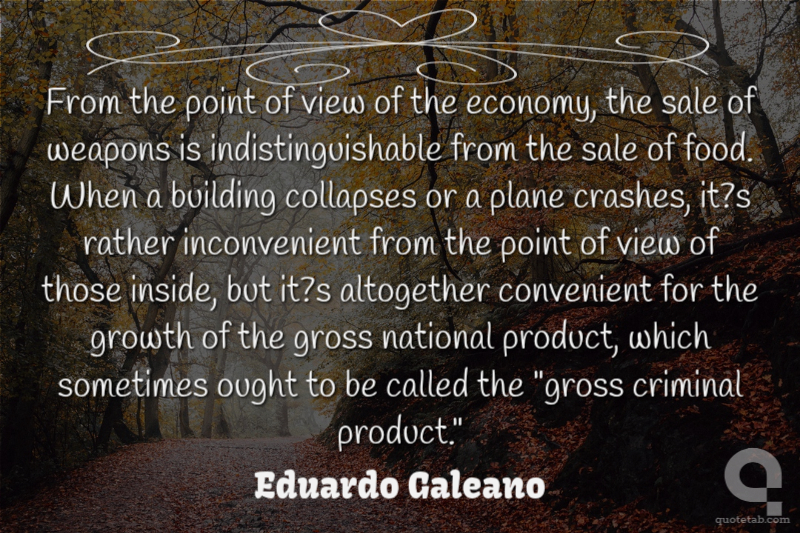 From the point of view of the economy, the sale of weapons is indistinguishable from the sale of food. When a building collapses or a plane crashes, it?s rather inconvenient from the point of view of those inside, but it?s altogether convenient for the growth of the gross national product, which sometimes ought to be called the "gross criminal product."