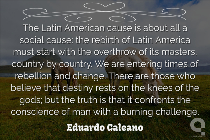 The Latin American cause is about all a social cause: the rebirth of Latin America must start with the overthrow of its masters, country by country. We are entering times of rebellion and change. There are those who believe that destiny rests on the knees of the gods; but the truth is that it confronts the conscience of man with a burning challenge.
