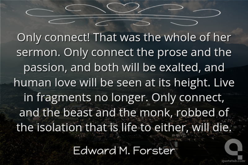 Only connect! That was the whole of her sermon. Only connect the prose and the passion, and both will be exalted, and human love will be seen at its height. Live in fragments no longer. Only connect, and the beast and the monk, robbed of the isolation that is life to either, will die.