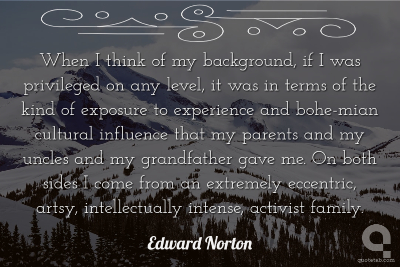 When I think of my background, if I was privileged on any level, it was in terms of the kind of exposure to experience and bohe-mian cultural influence that my parents and my uncles and my grandfather gave me. On both sides I come from an extremely eccentric, artsy, intellectually intense, activist family.