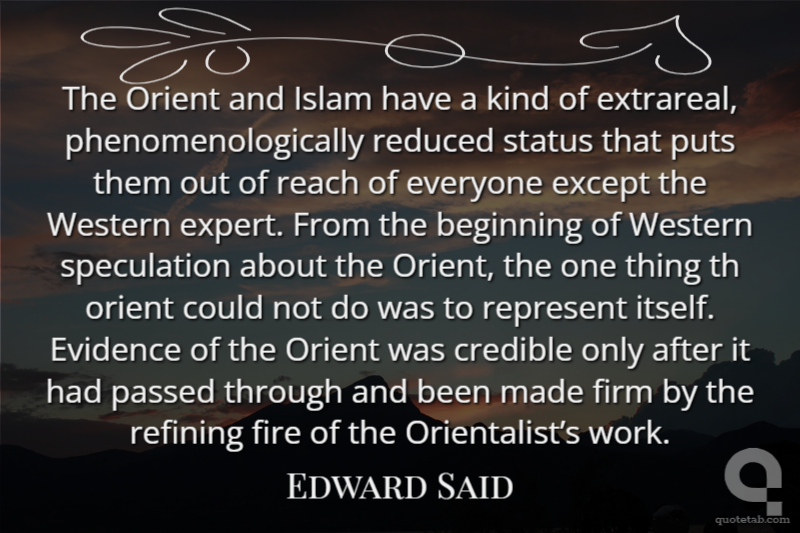 The Orient and Islam have a kind of extrareal, phenomenologically reduced status that puts them out of reach of everyone except the Western expert. From the beginning of Western speculation about the Orient, the one thing th orient could not do was to represent itself. Evidence of the Orient was credible only after it had passed through and been made firm by the refining fire of the Orientalist’s work.