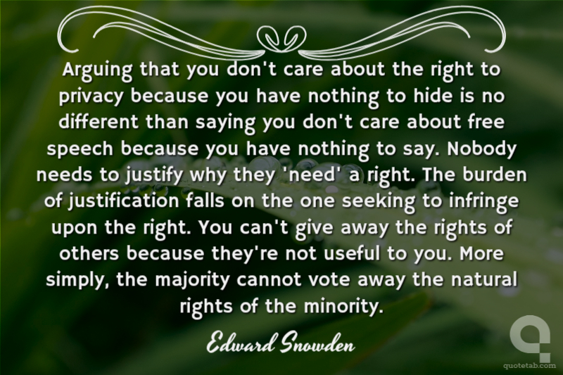 Arguing that you don't care about the right to privacy because you have nothing to hide is no different than saying you don't care about free speech because you have nothing to say. Nobody needs to justify why they 'need' a right. The burden of justification falls on the one seeking to infringe upon the right. You can't give away the rights of others because they're not useful to you. More simply, the majority cannot vote away the natural rights of the minority.
