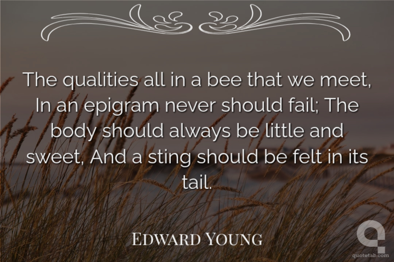 The qualities all in a bee that we meet, In an epigram never should fail; The body should always be little and sweet, And a sting should be felt in its tail.