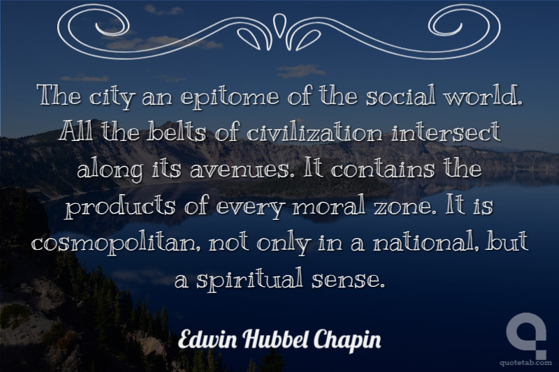 The city an epitome of the social world. All the belts of civilization intersect along its avenues. It contains the products of every moral zone. It is cosmopolitan, not only in a national, but a spiritual sense.