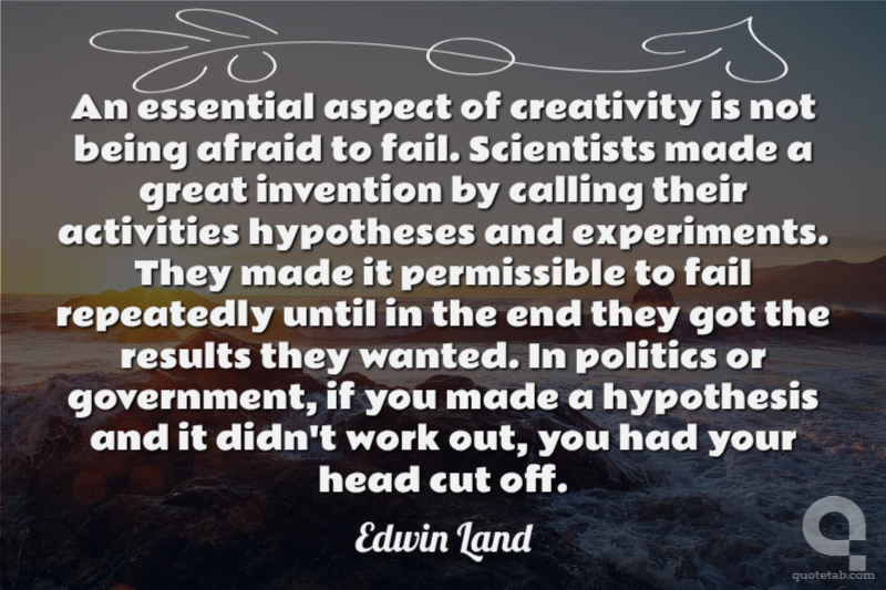 An essential aspect of creativity is not being afraid to fail. Scientists made a great invention by calling their activities hypotheses and experiments. They made it permissible to fail repeatedly until in the end they got the results they wanted. In politics or government, if you made a hypothesis and it didn't work out, you had your head cut off.