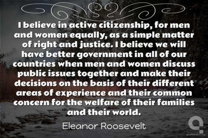 I believe in active citizenship, for men and women equally, as a simple matter of right and justice. I believe we will have better government in all of our countries when men and women discuss public issues together and make their decisions on the basis of their different areas of experience and their common concern for the welfare of their families and their world.