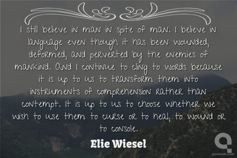I still believe in man in spite of man. I believe in language even though it has been wounded, deformed, and perverted by the enemies of mankind. And I continue to cling to words because it is up to us to transform them into instruments of comprehension rather than contempt. It is up to us to choose whether we wish to use them to curse or to heal, to wound or to console.