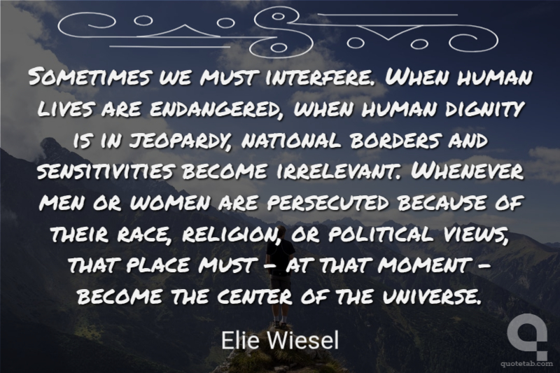 Sometimes we must interfere. When human lives are endangered, when human dignity is in jeopardy, national borders and sensitivities become irrelevant. Whenever men or women are persecuted because of their race, religion, or political views, that place must - at that moment - become the center of the universe.