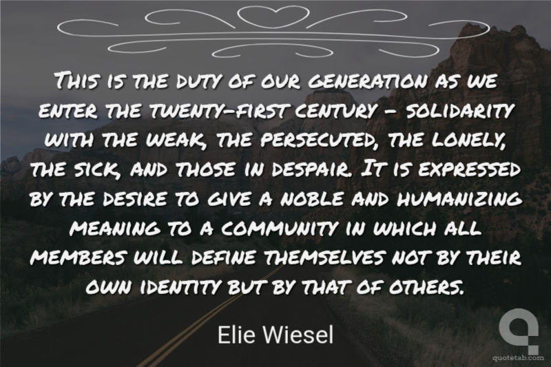 This is the duty of our generation as we enter the twenty-first century - solidarity with the weak, the persecuted, the lonely, the sick, and those in despair. It is expressed by the desire to give a noble and humanizing meaning to a community in which all members will define themselves not by their own identity but by that of others.