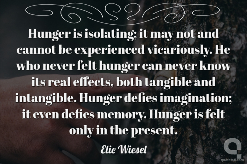 Hunger is isolating; it may not and cannot be experienced vicariously. He who never felt hunger can never know its real effects, both tangible and intangible. Hunger defies imagination; it even defies memory. Hunger is felt only in the present.