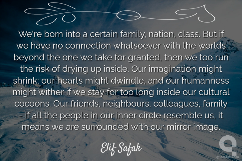 We're born into a certain family, nation, class. But if we have no connection whatsoever with the worlds beyond the one we take for granted, then we too run the risk of drying up inside. Our imagination might shrink; our hearts might dwindle, and our humanness might wither if we stay for too long inside our cultural cocoons. Our friends, neighbours, colleagues, family - if all the people in our inner circle resemble us, it means we are surrounded with our mirror image.