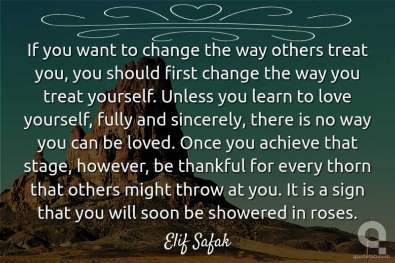 If you want to change the way others treat you, you should first change the way you treat yourself. Unless you learn to love yourself, fully and sincerely, there is no way you can be loved. Once you achieve that stage, however, be thankful for every thorn that others might throw at you. It is a sign that you will soon be showered in roses.