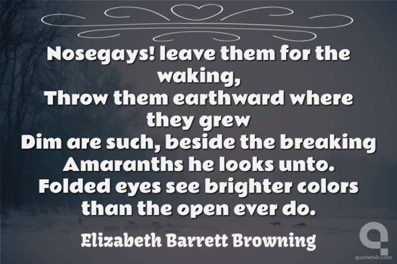 Nosegays! leave them for the waking, Throw them earthward where they grew Dim are such, beside the breaking Amaranths he looks unto. Folded eyes see brighter colors than the open ever do.
