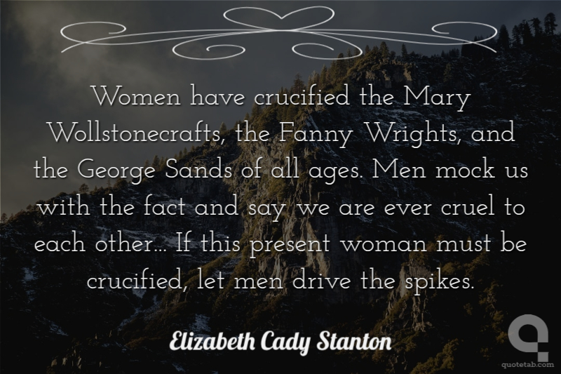 Women have crucified the Mary Wollstonecrafts, the Fanny Wrights, and the George Sands of all ages. Men mock us with the fact and say we are ever cruel to each other... If this present woman must be crucified, let men drive the spikes.