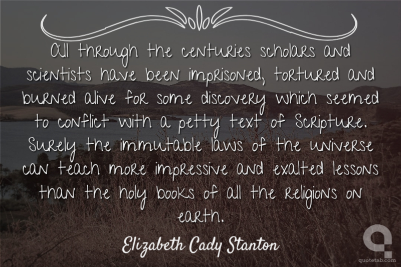 All through the centuries scholars and scientists have been imprisoned, tortured and burned alive for some discovery which seemed to conflict with a petty text of Scripture. Surely the immutable laws of the universe can teach more impressive and exalted lessons than the holy books of all the religions on earth.