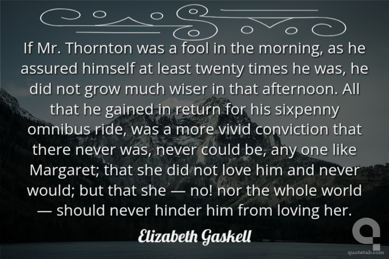 If Mr. Thornton was a fool in the morning, as he assured himself at least twenty times he was, he did not grow much wiser in that afternoon. All that he gained in return for his sixpenny omnibus ride, was a more vivid conviction that there never was, never could be, any one like Margaret; that she did not love him and never would; but that she — no! nor the whole world — should never hinder him from loving her.