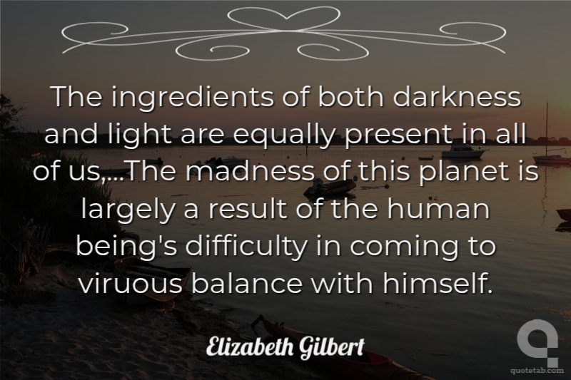 The ingredients of both darkness and light are equally present in all of us,...The madness of this planet is largely a result of the human being's difficulty in coming to viruous balance with himself.