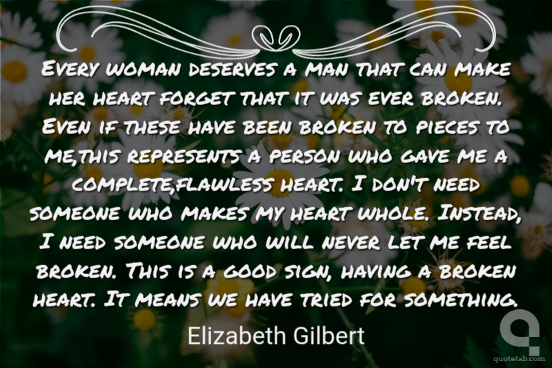 Every woman deserves a man that can make her heart forget that it was ever broken. Even if these have been broken to pieces to me,this represents a person who gave me a complete,flawless heart. I don't need someone who makes my heart whole. Instead, I need someone who will never let me feel broken. This is a good sign, having a broken heart. It means we have tried for something.