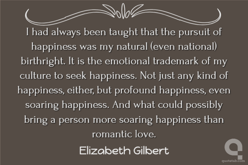 I had always been taught that the pursuit of happiness was my natural (even national) birthright. It is the emotional trademark of my culture to seek happiness. Not just any kind of happiness, either, but profound happiness, even soaring happiness. And what could possibly bring a person more soaring happiness than romantic love.
