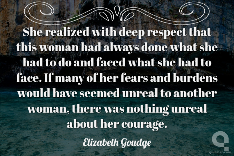 She realized with deep respect that this woman had always done what she had to do and faced what she had to face. If many of her fears and burdens would have seemed unreal to another woman, there was nothing unreal about her courage.