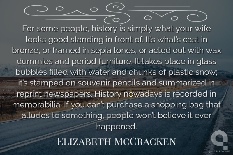 For some people, history is simply what your wife looks good standing in front of. It’s what’s cast in bronze, or framed in sepia tones, or acted out with wax dummies and period furniture. It takes place in glass bubbles filled with water and chunks of plastic snow; it’s stamped on souvenir pencils and summarized in reprint newspapers. History nowadays is recorded in memorabilia. If you can’t purchase a shopping bag that alludes to something, people won’t believe it ever happened.