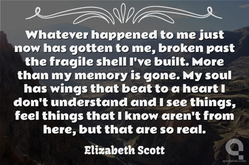 Whatever happened to me just now has gotten to me, broken past the fragile shell I've built. More than my memory is gone. My soul has wings that beat to a heart I don't understand and I see things, feel things that I know aren't from here, but that are so real.