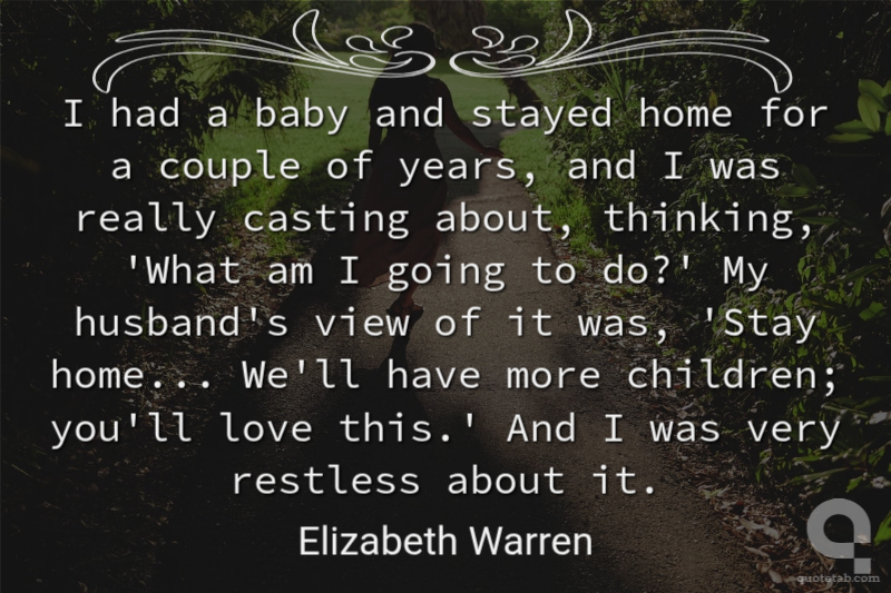 I had a baby and stayed home for a couple of years, and I was really casting about, thinking, 'What am I going to do?' My husband's view of it was, 'Stay home... We'll have more children; you'll love this.' And I was very restless about it.