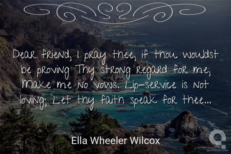 Dear friend, I pray thee, if thou wouldst be proving Thy strong regard for me, Make me no vows. Lip-service is not loving; Let thy faith speak for thee...